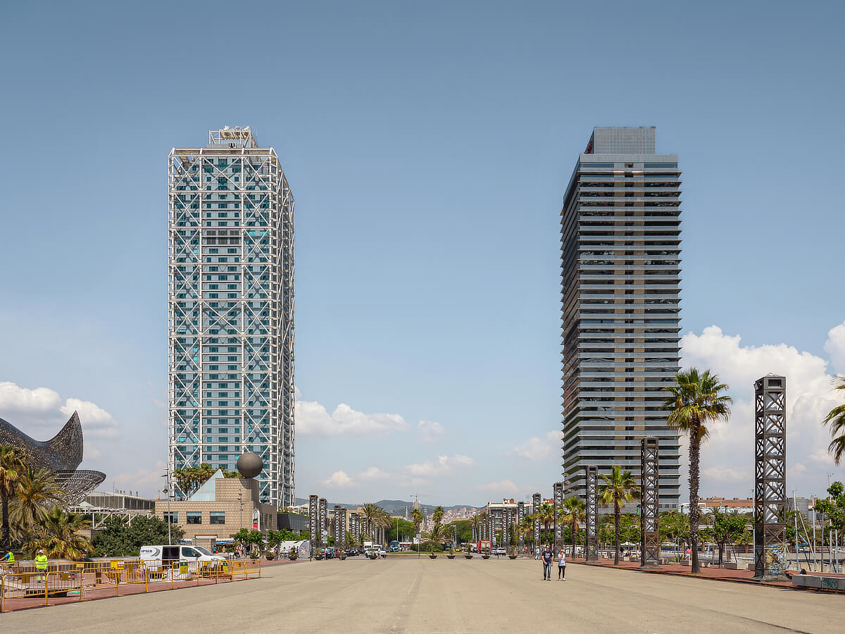 A semiologist would back this interpretation: they were evidently intended to say something particular about the city and this stretch of shoreline. Skyscrapers are distinctive landmarks, traditionally associated with high-value capitalist activities. In the twenty-first century they became favoured symbols of aspiring global cities, often incorporating locally relevant motifs in a search for singularity. The skyscrapers in Madrid known as the Puertas de Europa lean toward each other, and the placing and spacing of the pair in Barcelona does likewise suggest a gateway or entrance. (2)