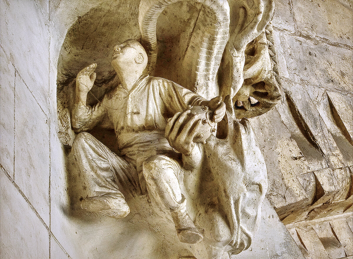 This conflict is represented by a remarkable sculpture in the cloister, apparently referencing the Old Testament Fall from the Garden of Eden, of a working man being tempted towards violence by a serpent-like representation of the devil.